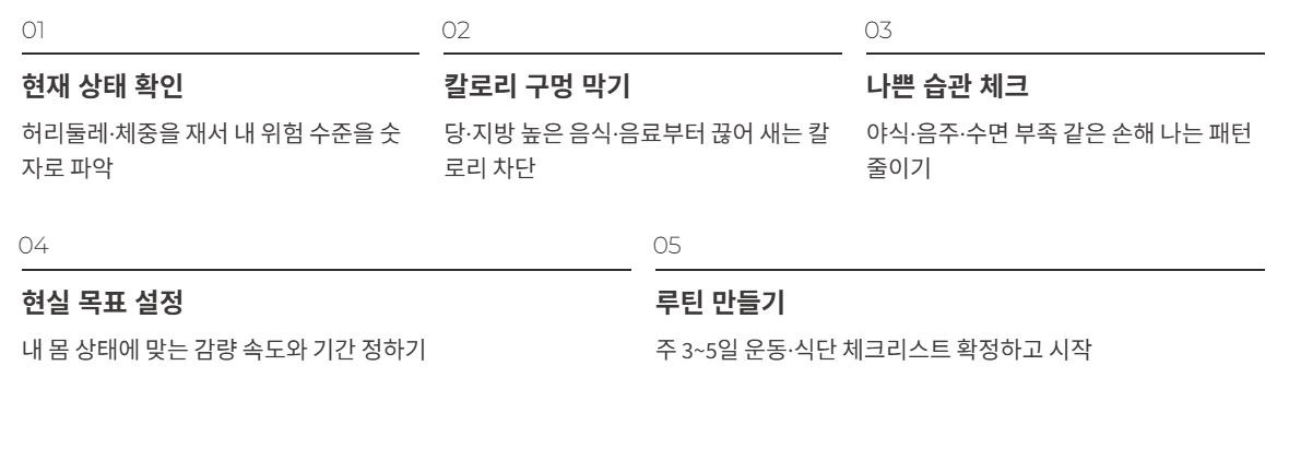 여기까지 읽으셨다면 이미 뱃살이 가져올 건강·비용 손해를 줄이기 위해 움직이기로 결심한 상태입니다.