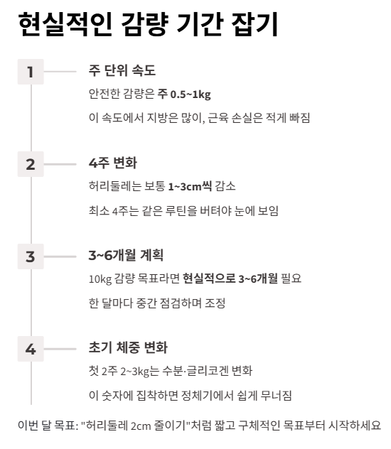 - 허리둘레는 보통 4주 단위로 1~3cm씩 줄어드는 경우가 많아, 최소 4주 이상은 같은 루틴을 버텨야 변화가 눈에 보입니다.