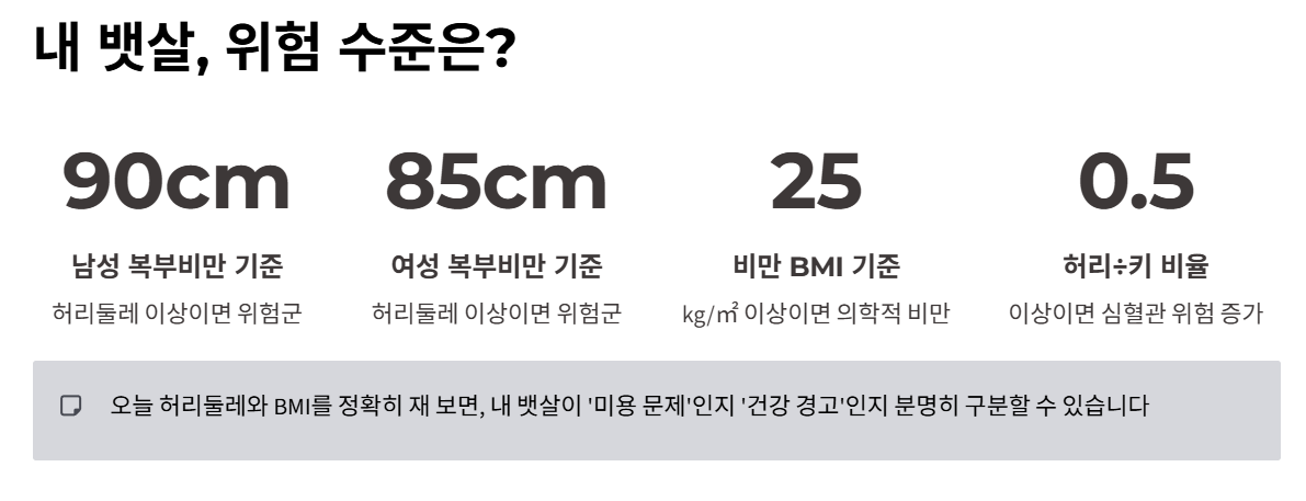 지금 허리둘레와 체질량지수(BMI)를 숫자로 확인해 두면, 앞으로 늘어나는 뱃살을 미리 끊어낼 수 있고 대사증후군·심혈관 질환 위험도 훨씬 일찍 줄일 수 있습니다.