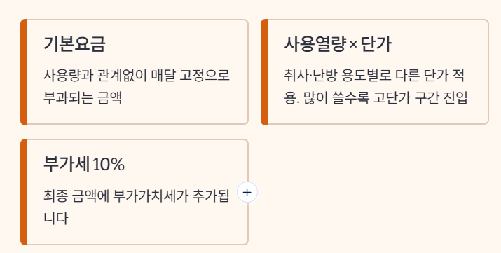 - 계절별 원료비·열량·요율 조정으로 단가가 바뀌면 같은 사용량에도 요금이 달라지므로, 정확한 단가·요율은 항상 공식 홈페이지 요금표·공지에서 최신 기준을 다시 확인해야 합니다.