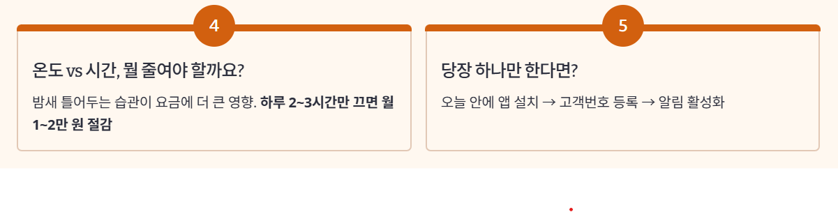 - 이번 달 검침 전까지 하루 2~3시간 난방 시간을 줄이거나 온도를 1~2도만 낮춰 보고, 예상요금 변화를 직접 확인해 우리 집 최적 패턴을 찾아둡니다.