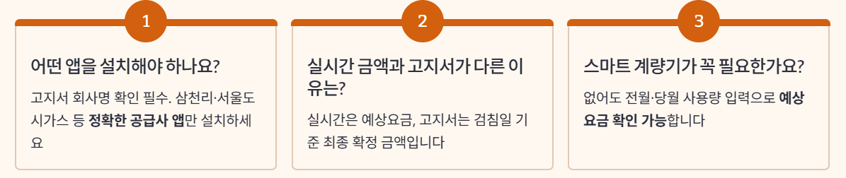- Q. 경기에 사는데 어떤 도시가스 앱을 깔아야 하나요? A. 경기·인천 대부분은 삼천리도시가스지만 일부 지역은 다른 사업자입니다. 고지서 상단의 회사명을 먼저 확인하고, 그 회사 이름으로 검색되는 공식 앱·가스앱만 설치해야 검침 전 며칠 동안 헛수고 없이 실제 요금을 관리할 수 있습니다.