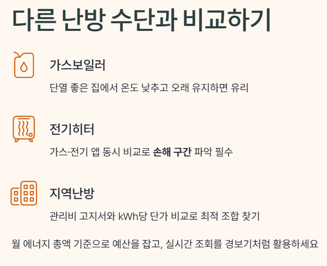 도시가스 요금만 따로 떼어 보면 “나오는 대로 내면 되지”라고 생각하기 쉽지만, 전기·지역난방·개별난방·전기히터·온열기 등 다른 난방 수단과 비교하면 어떤 조합이 가장 싸게 먹히는지가 분명해집니다.