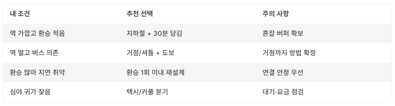 | 역이 가깝고 환승이 적다 | 지하철 중심 + 출발 30분 당김 | 혼잡 대비 버퍼 시간 확보 |