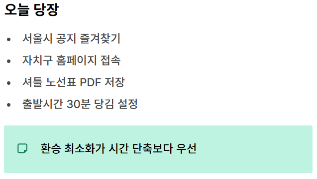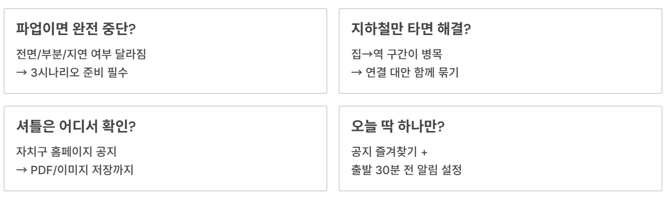 준비는 복잡할 필요가 없습니다. 내 이동을 3구간(집→환승역 / 환승역→목적지 / 퇴근·심야)으로 나누고, 각 구간에 대체수단 2개를 만든 뒤, 정상·부분·파업 3시나리오로 출발시간만 바꾸면 됩니다.