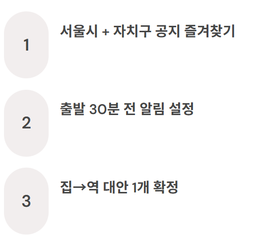 “서울시 공지 + 내 자치구 공지”를 즐겨찾기에 넣고, 출발 30분 전 알림을 설정하세요. 이 한 가지가 내일 아침의 혼란을 크게 줄입니다.