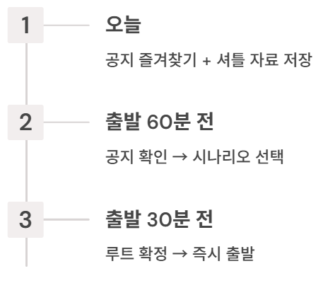 - 내일 출발 60분 전: 공지 확인 → 정상/부분/파업 시나리오 선택