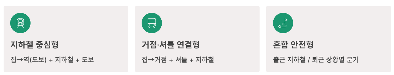 - 지하철 중심형: 집→역(도보/단거리) + 지하철 + 목적지 도보