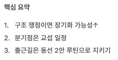 | 지하철 혼잡 폭증 | 압박↑(타결 압력↑) | 혼잡 회피(20~30분 조정) + 하차역 조정 |
