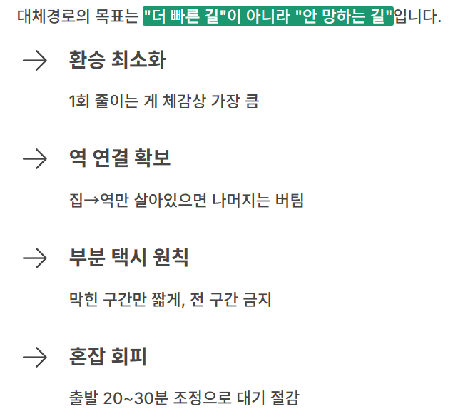 대체경로의 목표는 “더 빠른 길”이 아니라 “안 망하는 길”입니다. 한 번만 제대로 세팅해두면, 파업이 길어져도 매일 아침이 덜 힘들어요.