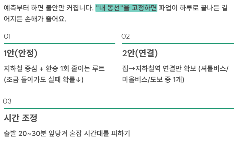 오늘은 이것만 해도 충분합니다. “내 동선 2안”을 문장 3줄로 고정해두세요. (1안: 지하철 중심 / 2안: 집→역 연결 / 비상: 부분 택시)