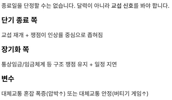 종료일을 단정할 수는 없습니다. 대신 “언제까지”를 가늠하려면 달력이 아니라 교섭 신호를 봐야 합니다. 교섭 일정이 재개되고 쟁점이 압축되면 빠르게 정리될 수 있고, 구조 쟁점이 계속 남으면 길어질 가능성이 커요.
