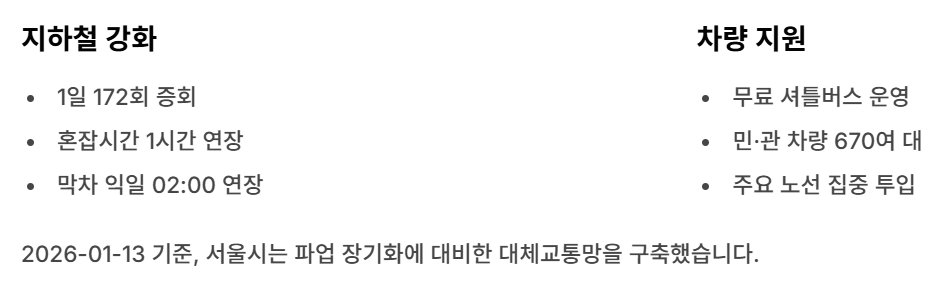 | 대체교통 체력 | 지하철 증회·막차·셔틀로 출근 유지 | 혼잡 폭증 또는 ‘버틸만함’(장기전 가능) |