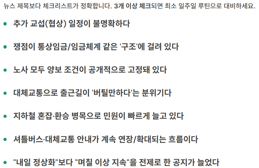 핵심 요약: (1) 구조 쟁점이면 장기화 가능성↑ (2) 분기점은 교섭 일정 (3) 출근길은 동선 2안 루틴으로 지키기.