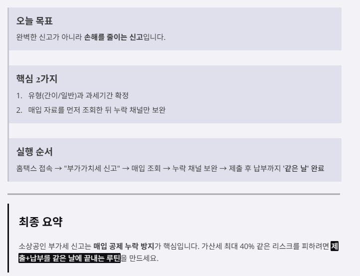 최종 요약: 소상공인 부가세 신고는 매입 공제 누락 방지가 핵심입니다. 가산세 최대 40% 같은 리스크를 피하려면 제출+납부를 같은 날에 끝내는 루틴을 만드세요.