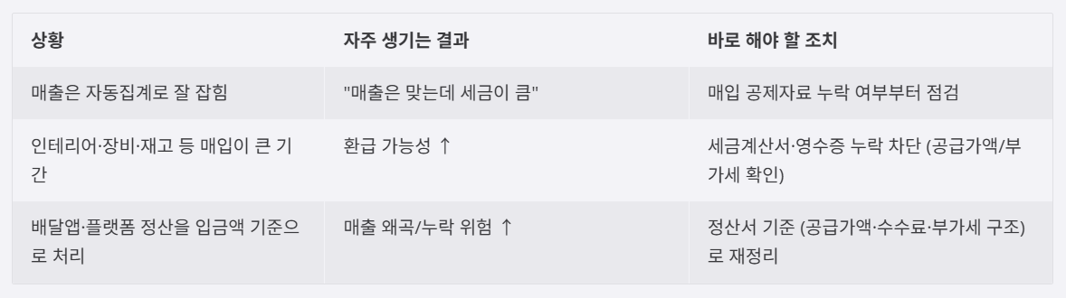 | 매출은 자동집계로 잘 잡힘 | “매출은 맞는데 세금이 큼” | 매입 공제자료 누락 여부부터 점검 |