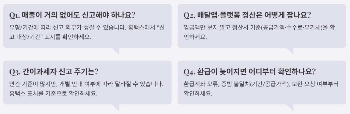 - 채널이 많은 타입: 배달·플랫폼·오프라인 혼합이면 누락 위험 ↑ → 세무대리/플랫폼 고려