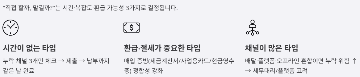 관점 2(비용 우선): 단순 업종·단일 채널은 직접 신고도 가능하지만, 매입이 복잡하거나 환급 가능성이 큰 기간은 “실수 1번”이 더 비싸질 수 있습니다.