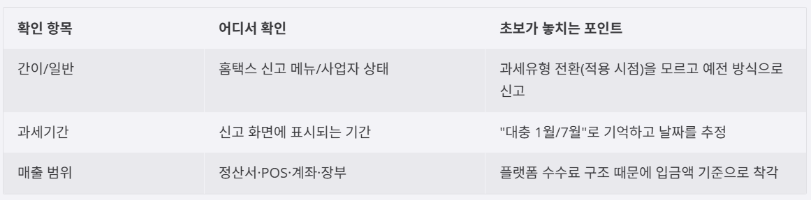 | 간이/일반 | 홈택스 신고 메뉴/사업자 상태 | 과세유형 전환(적용 시점)을 모르고 예전 방식으로 신고 |
