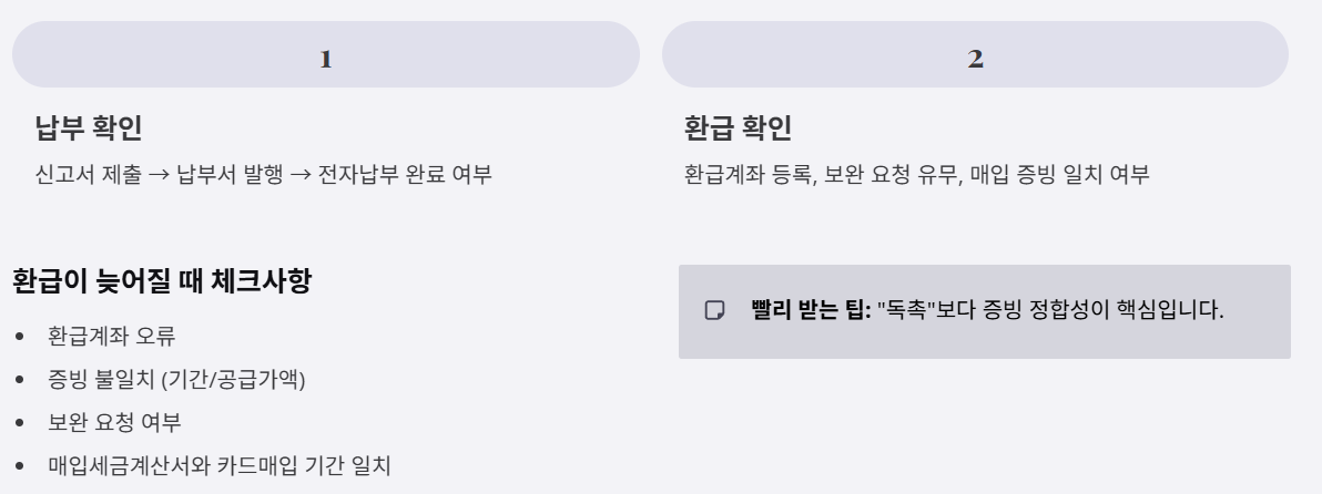 - 환급 확인: 환급계좌 등록, 보완 요청 유무, 매입 증빙(세금계산서/카드매입) 일치 여부