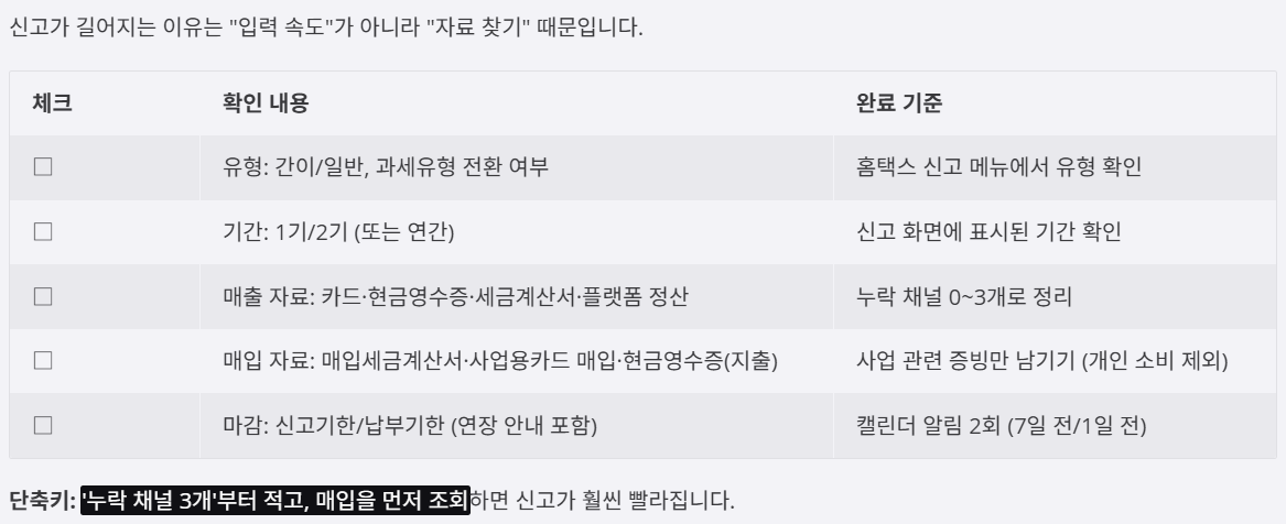 요약: 표를 먼저 채우면 “중간에 멈추는 신고”가 사라집니다. 오늘은 유형/기간/매입부터 채워보세요.