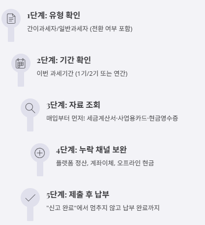 유형 확인(간이/일반) → 기간 확인 → 자료 조회(매입부터) → 누락 채널 보완 → 제출 → 납부. 이 순서만 지키면 “괜히 더 내는 신고” 확률이 확 떨어집니다.