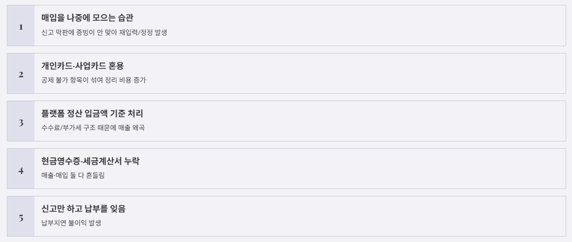 - 매입을 나중에 모으는 습관 → 신고 막판에 증빙이 안 맞아 재입력/정정