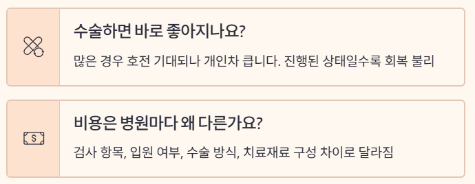- 수술은 “기능 보존”입니다: 늦어지면 회복이 불리해질 수 있습니다.