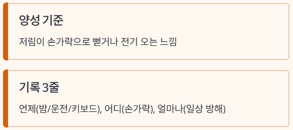 - 기록 3줄: 언제(밤/운전/키보드), 어디(손가락), 얼마나(일상 방해)를 적습니다.