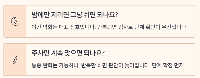 - Q. 주사만 계속 맞으면 되나요? A. 통증 완화는 될 수 있지만, 반복만 하면 판단이 늦어질 수 있습니다. 단계 확정이 먼저입니다.