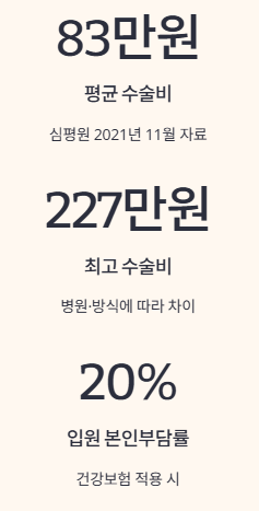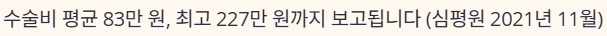 - 수술비(심평원 자료, 2021년 11월): 평균 830000원, 최소 290000원, 최대 2270000원으로 제시된 바 있습니다.