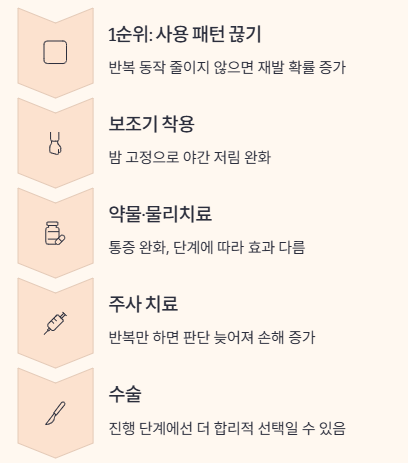 - 1순위: 손목 사용 패턴을 끊습니다. 반복 동작을 줄이지 않으면 재발 확률이 커집니다.