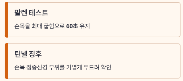 - 팔렌 테스트: 손목을 최대 굽힘으로 60초 유지합니다.
