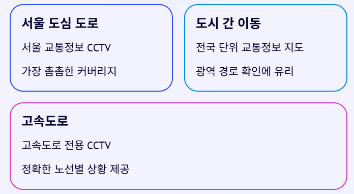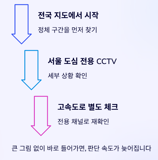 모든 CCTV를 한 곳에서 해결하려 하면 시간만 낭비됩니다. 도로 종류에 따라 확인 채널을 나누는 것이 가장 빠른 방법입니다.
