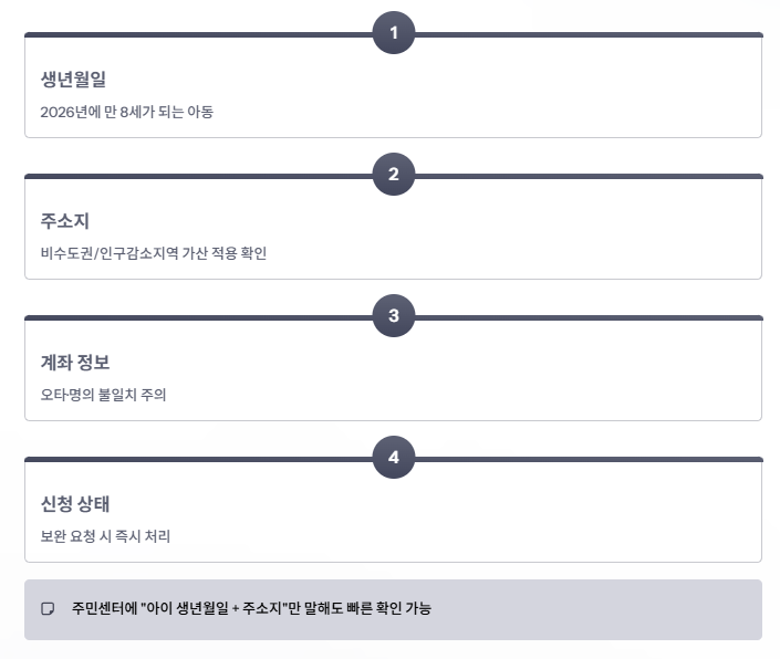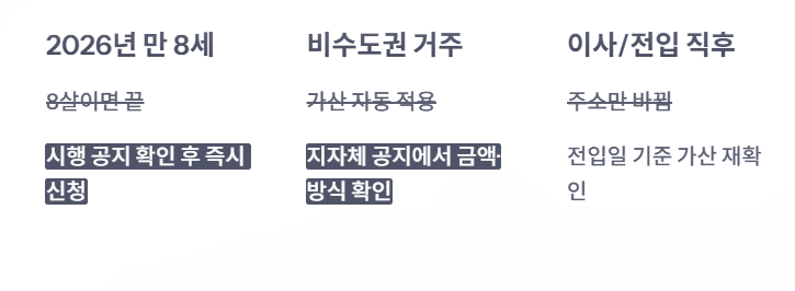 | 2026년에 만 8세 | “8살이면 끝이겠지” | 시행 공지 확인 후 즉시 신청(또는 주민센터 문의) |