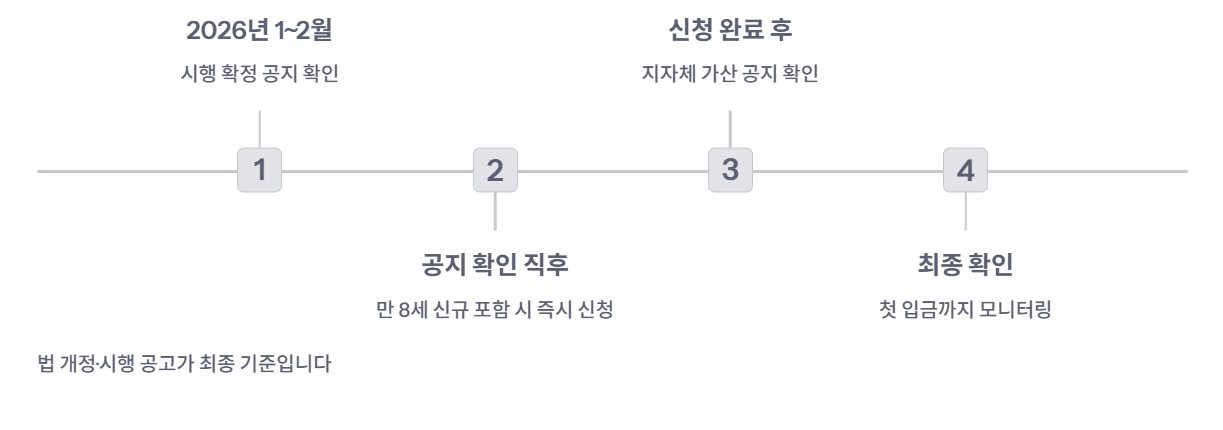 만 8세 신규 포함 가능 가정은 “시행 공지 확인 → 즉시 신청 → 첫 입금 확인”을 1세트로 묶어 실행하세요.