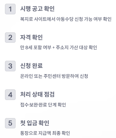 ① 시행 공고 확인 → ② 만 8세 포함 여부/주소지 가산 확인 → ③ 복지로 신청(또는 주민센터) 후 처리 상태 확인