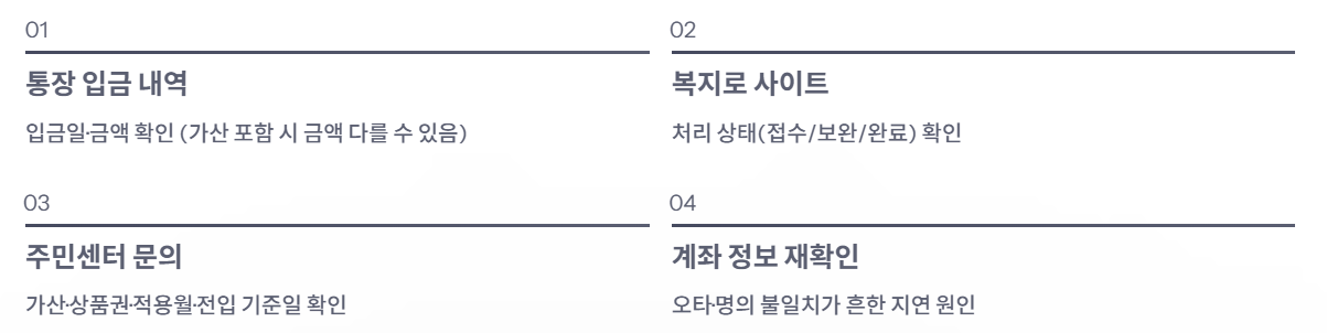 계좌 오타/명의 → 복지로 처리 상태(보완 요청) → 전입 처리 → 가산 분리 지급 순으로 확인하면 빠릅니다.