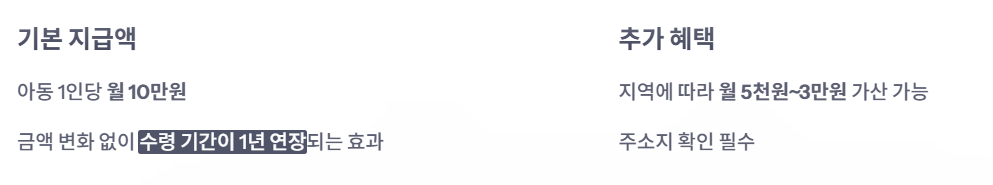 요약: 월 10만원은 그대로일 가능성이 크고, 진짜 차이는 “만 8세까지 1년 연장 + (해당 시) 지역 가산”입니다.
