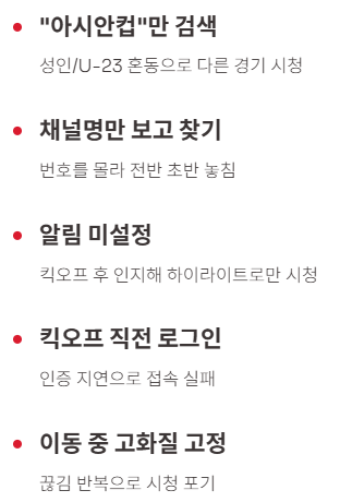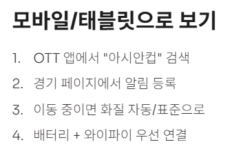 | OTT 구독 중 | 낮음~중간 | 앱에서 “아시안컵” 검색 → 라이브 제공/전 경기 범위 확인 → 알림 |