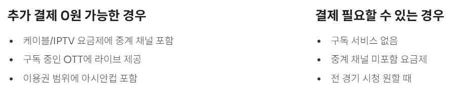 | 구독 없음 | 중간~높음 | 전 경기/한국 경기 결정 → 필요한 서비스 1개만 결제(이용권 범위 확인) |