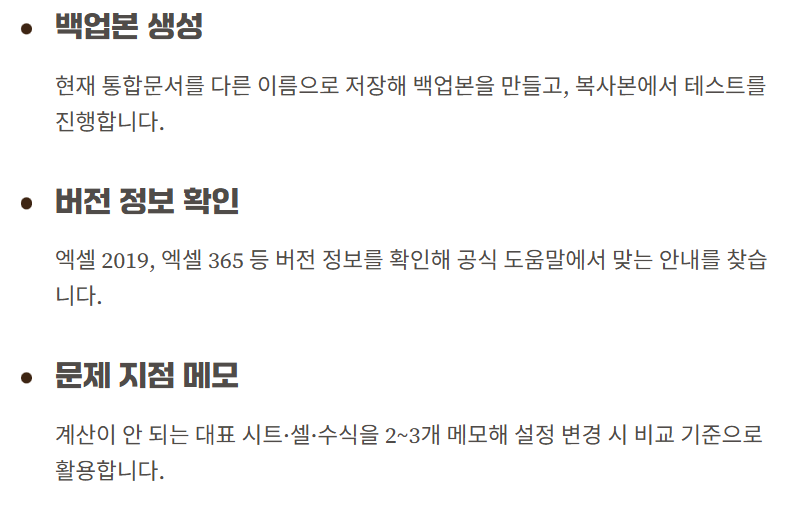 - 계산이 안 되는 대표 시트·셀·수식을 2~3개 정도 메모해 두고, 설정을 바꿀 때마다 같은 지점을 기준으로 결과가 달라지는지 비교하면 원인 파악에 큰 도움이 됩니다.