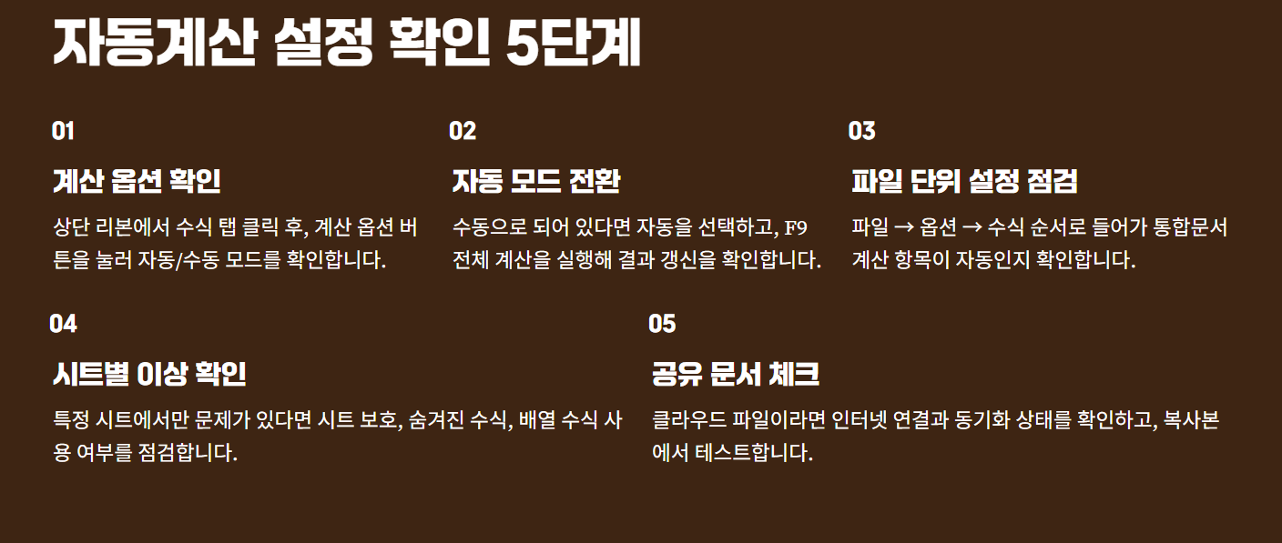 정리하면 엑셀 수식이 갑자기 계산 안 될 때 가장 먼저 확인해야 할 자동계산 설정 방법은 계산 모드, 셀 서식, 수식 구조, 파일·환경 특성을 순서대로 점검하는 것입니다.