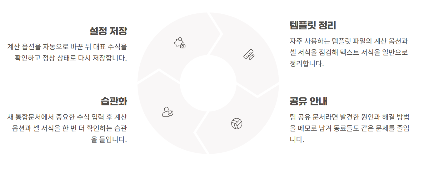 - 템플릿·양식 파일에서 텍스트 서식으로 저장된 수식이나 불필요한 순환 참조가 있는지 점검해 두면, 이후 갑작스러운 계산 오류를 미리 줄일 수 있습니다.