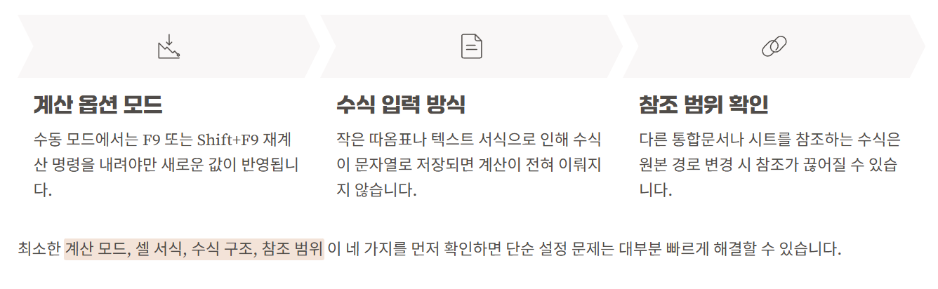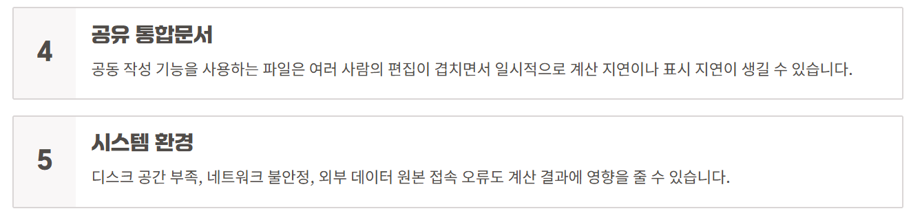 - 디스크 공간 부족, 네트워크 불안정, 외부 데이터 원본 접속 오류도 계산 결과에 영향을 줄 수 있으니, 작업 PC 환경과 연결 상태를 함께 점검해 두면 문제 재발 가능성을 줄일 수 있습니다.