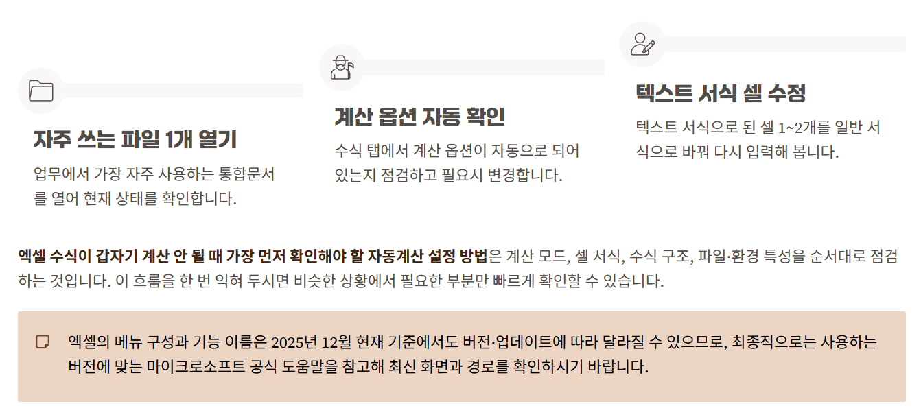 - 오늘 자주 사용하는 통합문서 한 개를 열어 수식 탭 → 계산 옵션이 자동으로 되어 있는지, 수동 모드로 고정된 파일은 없는지 먼저 확인해 보세요.