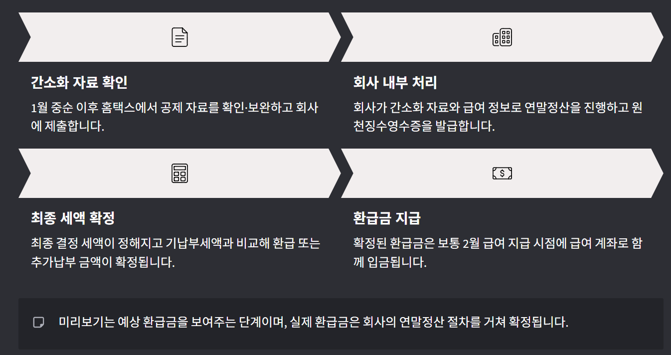 - 회사 내부 연말정산 처리: 회사는 근로자별 간소화 자료와 급여 정보를 바탕으로 연말정산을 진행하고, 원천징수영수증을 발급하며, 이 과정에서 일부 공제 항목의 인정 여부가 미리보기와 달라질 수 있습니다.