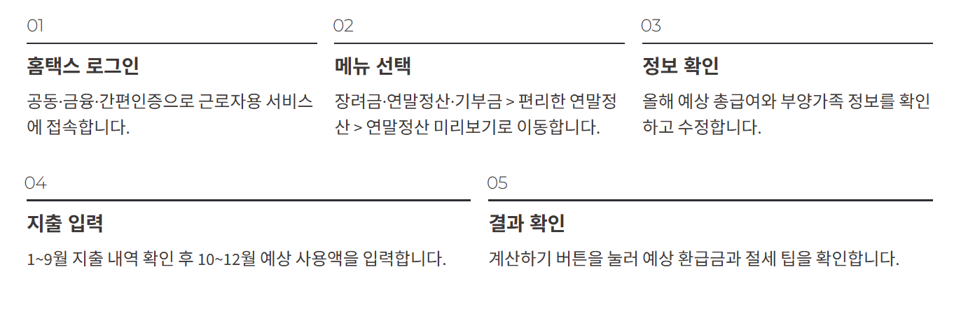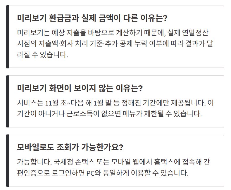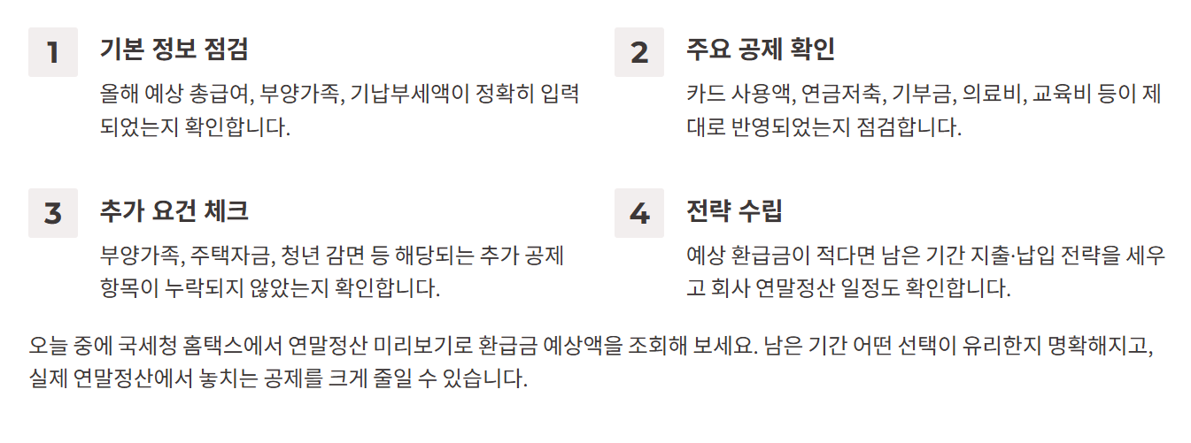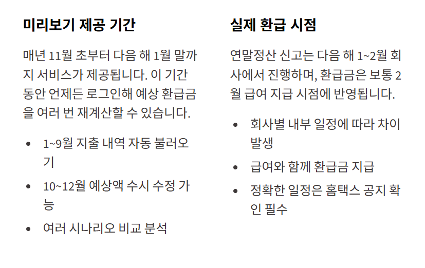 - 미리보기 기간이 지나면 더 이상 예상 시뮬레이션을 수정할 수 없으므로, 최소 1번 이상은 오픈 초기(11~12월)에 접속해 환급 예상액과 부족한 공제 항목을 점검해 두는 것이 안전합니다.