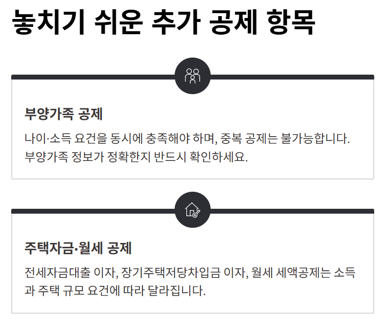 특히 부양가족 인정 기준, 주택 관련 항목, 특정 감면 제도 등은 조금만 놓쳐도 환급액 차이가 커질 수 있어, 내 상황에 해당되는지 한 번 더 체크해 보는 것이 좋습니다.