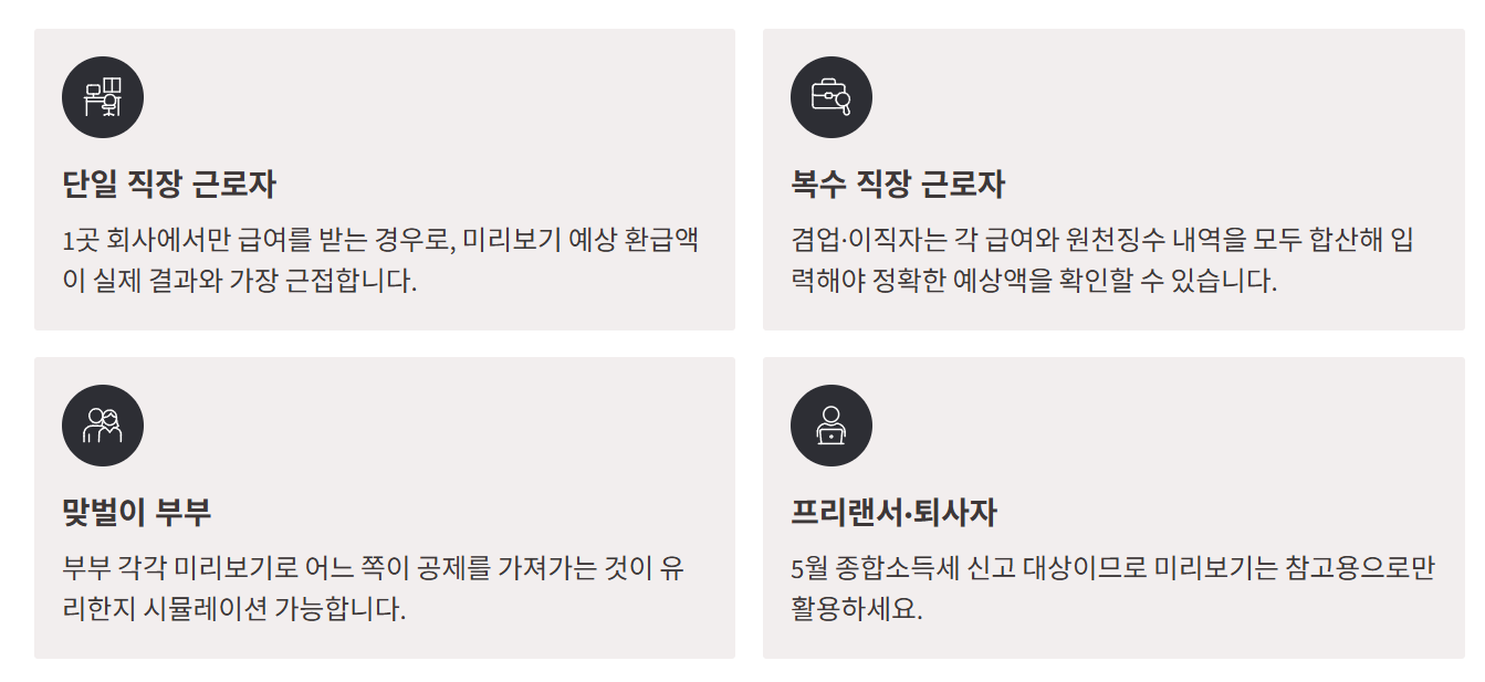 다만 근무 형태, 소득 구조, 가족 구성에 따라 화면에서 보여주는 환급 예상액의 의미와 활용 방법이 달라질 수 있기 때문에, 먼저 내가 어떤 유형에 속하는지 구분해 보는 것이 중요합니다.